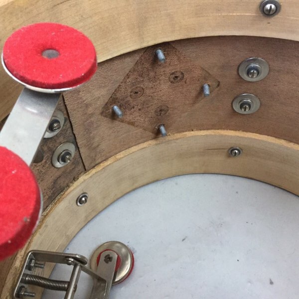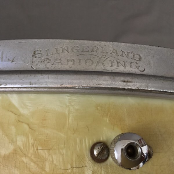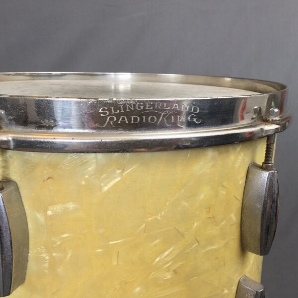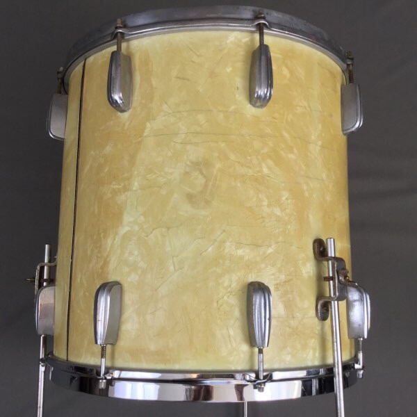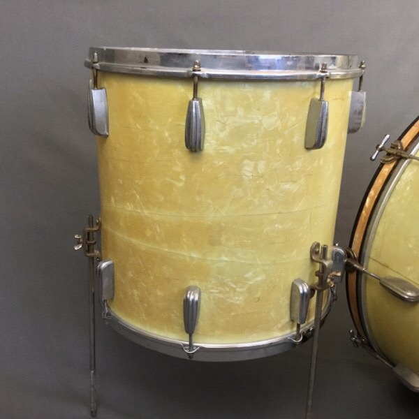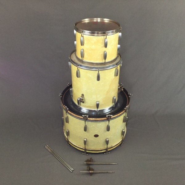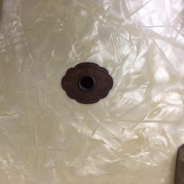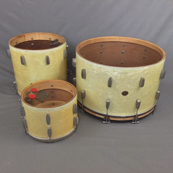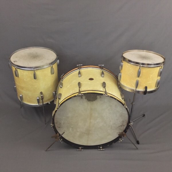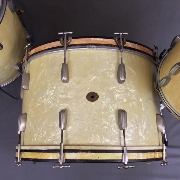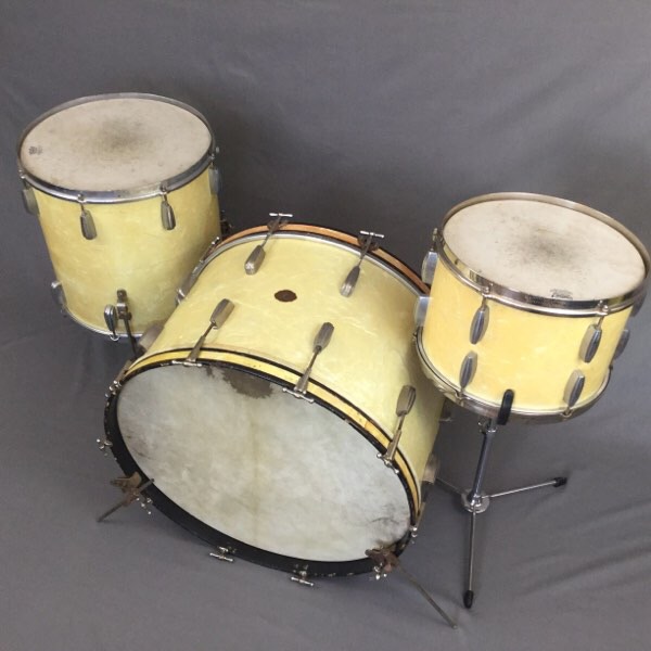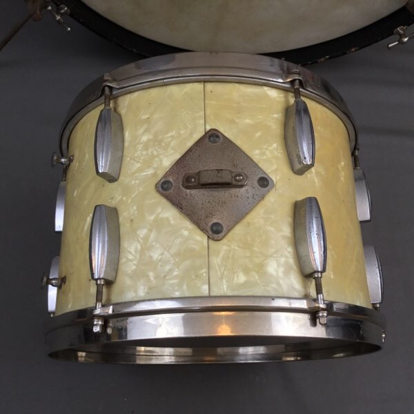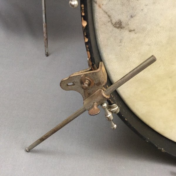 A very nice but heavily worn 40s RK Could Badge set. I’m sure this one could tell a story or two! As you can see, plenty of wrap wear, yellowing and wrap cracking. Other issues are : non original metal work parts, Bassdrum claws and Ts and floortom legs, (Although the Ts and claws are period correct).There are also three very small holes under the diamond plate of the 13″ tom. To clarify, all shells are solid and sound and all wrap is tight. Snare stand is for display only.