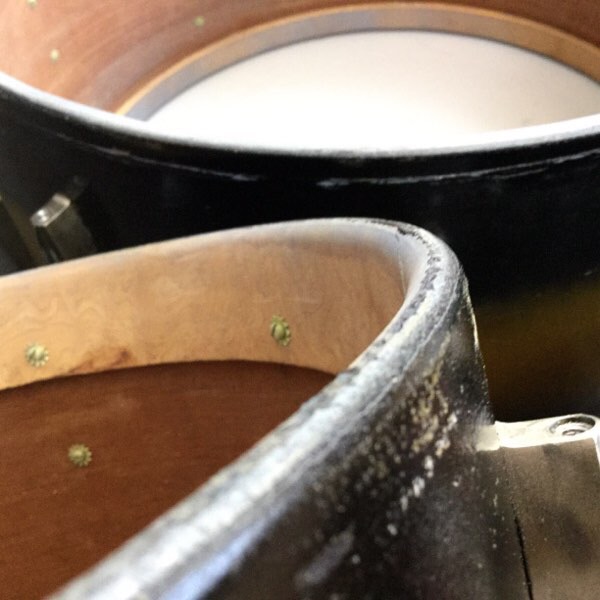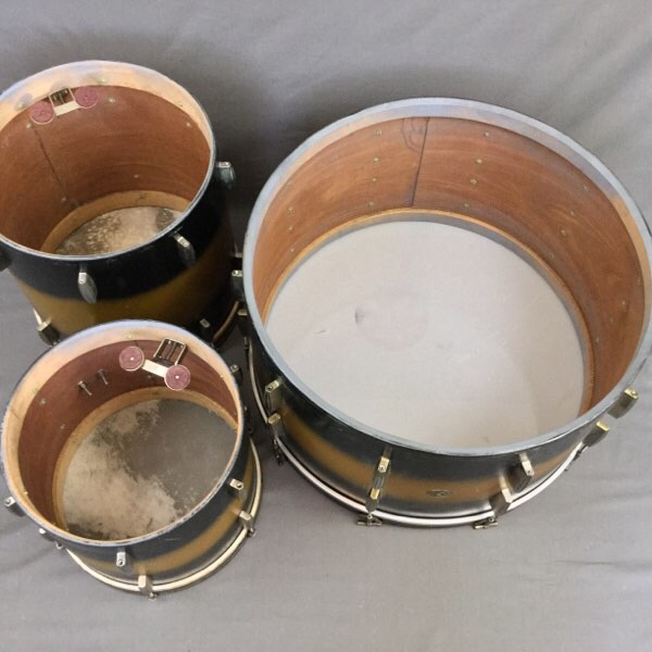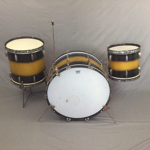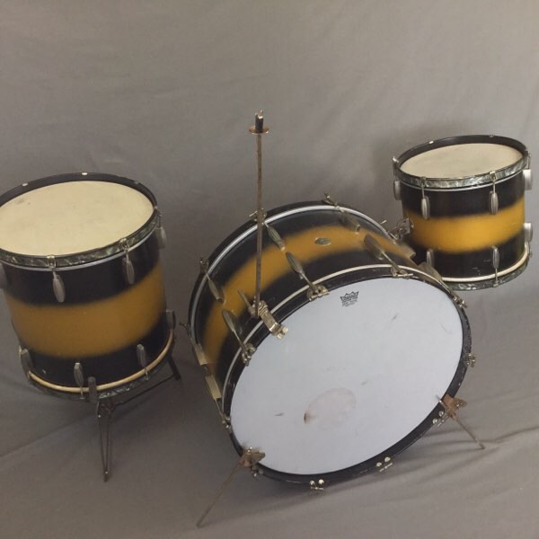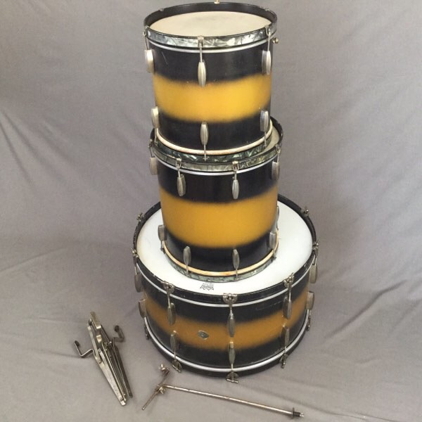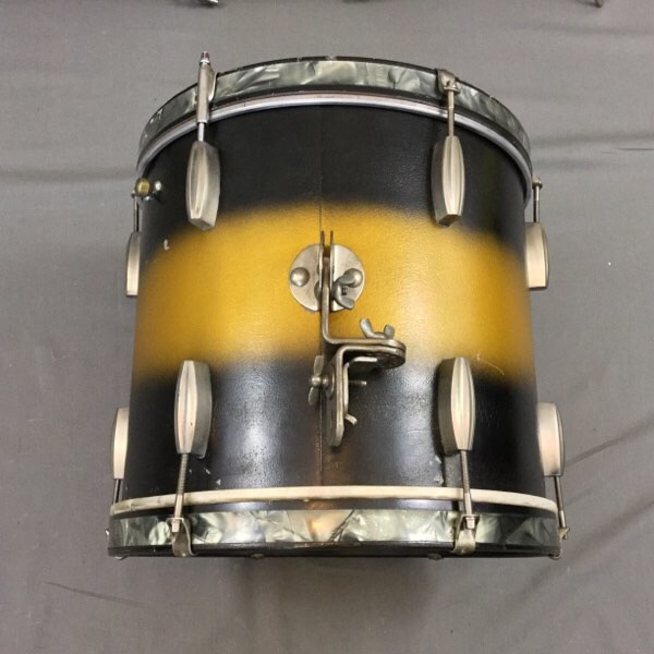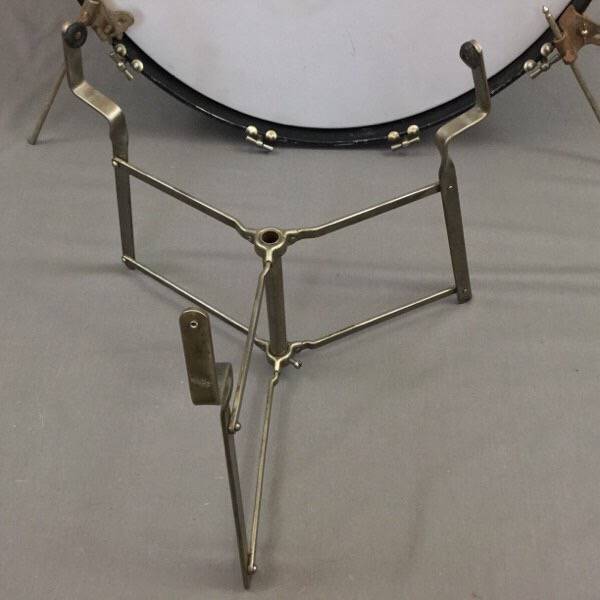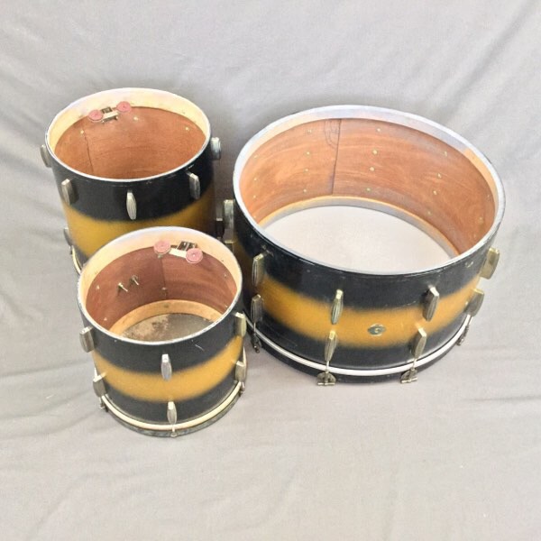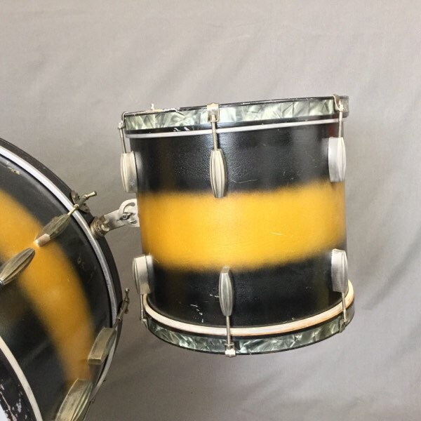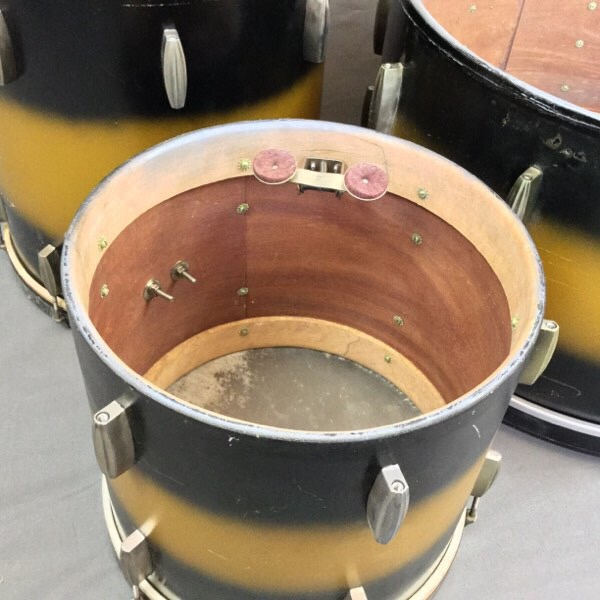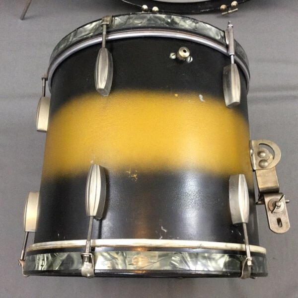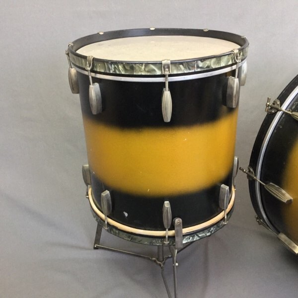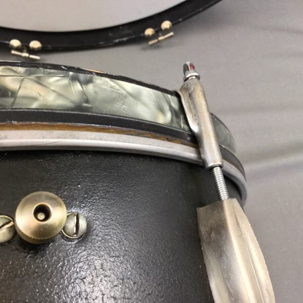 Very nice wooden hoops all round, the toms still have the original BDP inlay stapled in place. The metal work is great, the cigar lugs are beautiful and crack free, all metal parts look to have been tumbled and are free of rust. The hoop claws on the toms are original apart from one and all bass drum Ts and claws are period correct but not Slingerland. The 16″ comes with no leg mounts but a tom basket, that in itself is a hard item to find. Bassdrum clip on spurs are not included in the sale.