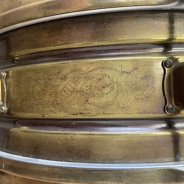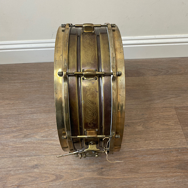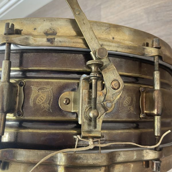 This is a beautiful example of an early Leedy engraved Black Elite snare drum. Leedy’s version of the black beauty with a hand engraving pattern in the nickel shell. The nobby gold hardware provides a beautiful contrast next to the black shell. I date this drum to the mid 20s because of the 4 screw elite lugs.There is a Indianapolis stamp on the top rim and a script Leedy logo on the strainer and even has the Leedy speedway strainer.