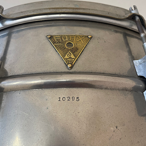 Hawkes Merged with Boosey in 1930 and the pyramid badge was introduced in 1935. Ajax had a close relationship with the Ludwig and Leedy companies in America. This drum has the early Leedy ‘Bow-Tie’ or ‘X-Lugs’ found on many mid 1930’s drums.